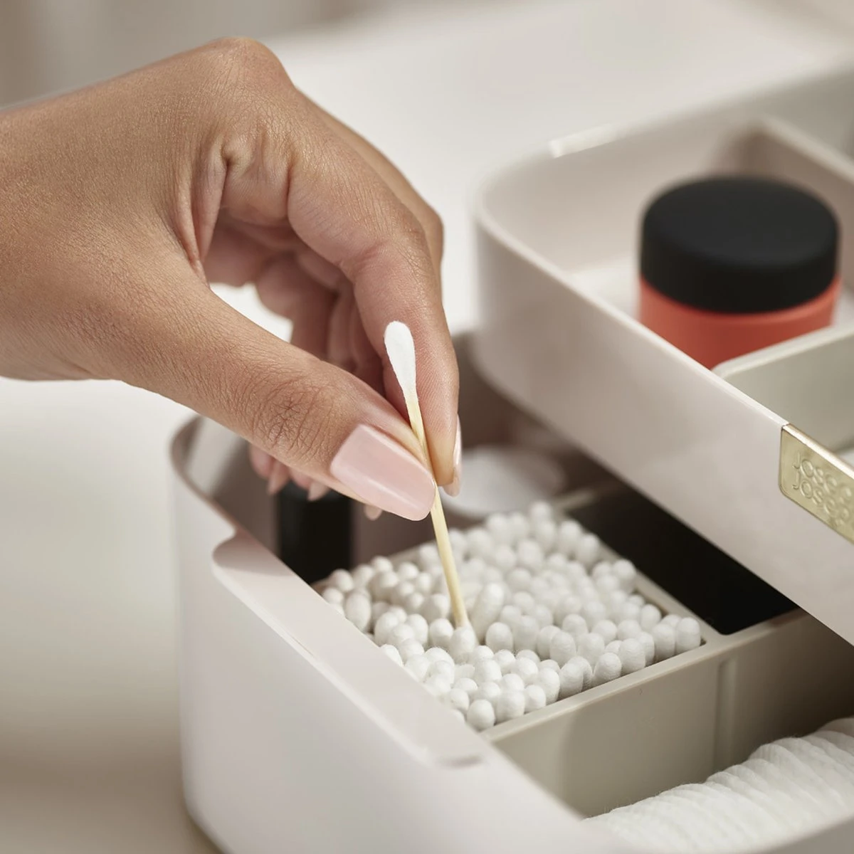 De opbergdoos voor make-up is niet alleen praktisch in gebruik door zijn vele sorteervakken en uitneembaar bakje, hij staat ook nog eens prachtig in je slaapkamer of badkamer. Het kleine exemplaar heeft 3 sorteervakken die perfect kunnen dienen als kwastenhouder. De grote variant van de make-up organizer heeft zes sorteervakken waar lipsticks, oogschaduwpotjes en crème in kan staan. Beide exemplaren van de cosmetica opbergdoos hebben een uitneembaar bakje waarin bijvoorbeeld wattenschijfjes of wattenstaafjes opgeborgen kunnen worden. Liever één grote bak om bijvoorbeeld parfum in te zetten? Haal simpelweg de uitneembare verdelers uit de make-up opbergdoos. Ook kun je nog in de Viva collectie van Joseph Joseph kijken of je een leuke combinatie kunt vinden.