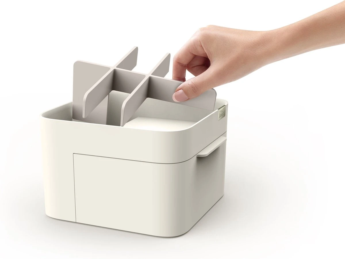 – Medium: 18,5 cm breed, 19,5 cm diep en 12 cm hoog. 6 sorteervakken bovenop + uitneembaar opbergbakje met 4 sorteervakken.